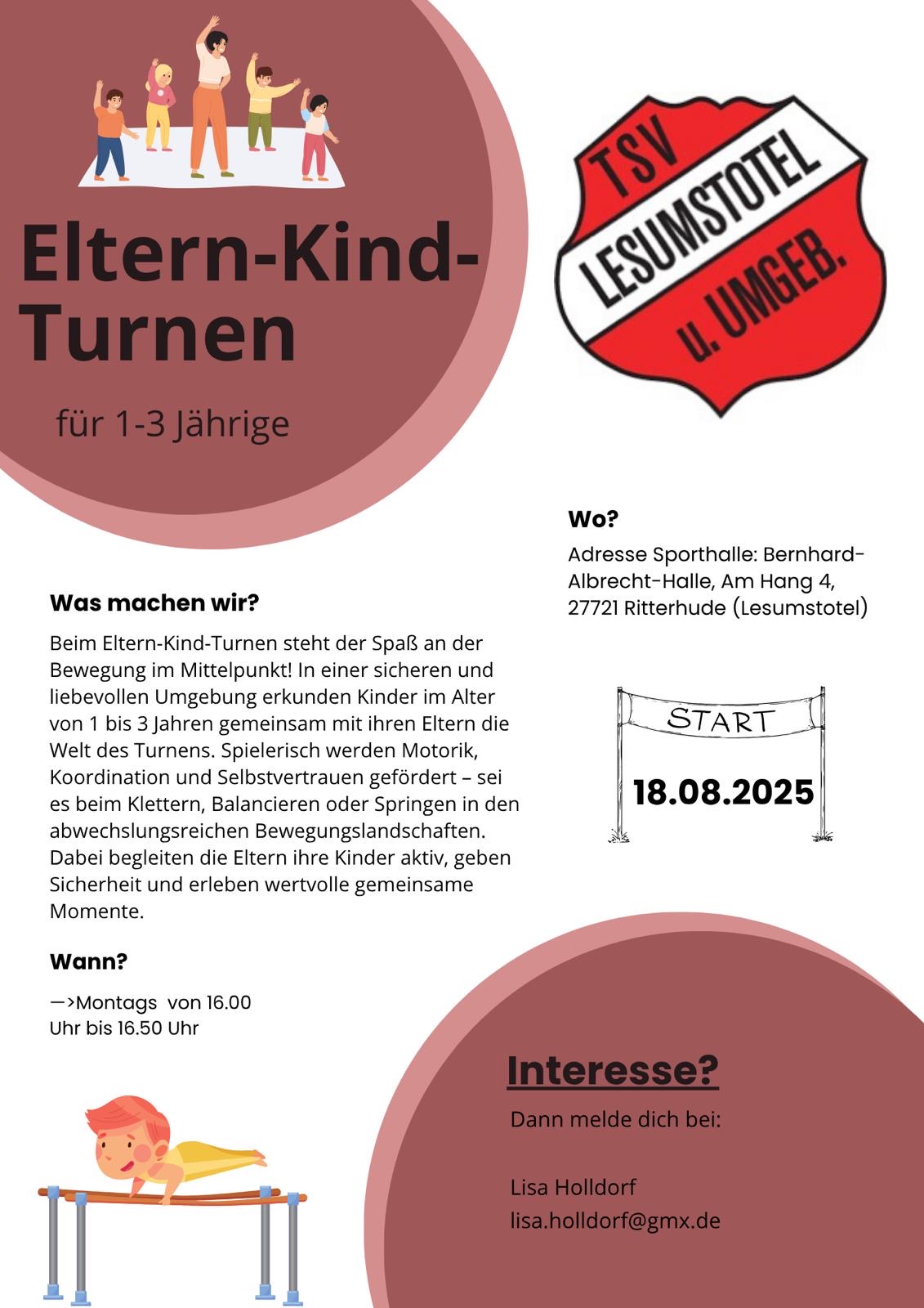 Die Eltern-Kind-Turngruppe ist eine altersgemischte Gruppe für Kinder im Alter von 1-3 Jahren! Beim Eltern-Kind-Turnen stehen im Vordergrund der Spaß an der Bewegung und das gemeinsame Ausprobieren neuer Spielmöglichkeiten. Die Stunde fängt immer mit einem Begrüßungslied an, danach gibt es an der bereits schon aufgebauten Gerätelandschaft jede Menge zu klettern, zu springen, zu balancieren und zu toben. Mit Fingerspielen und Liedern wird die Turnstunde beendet.